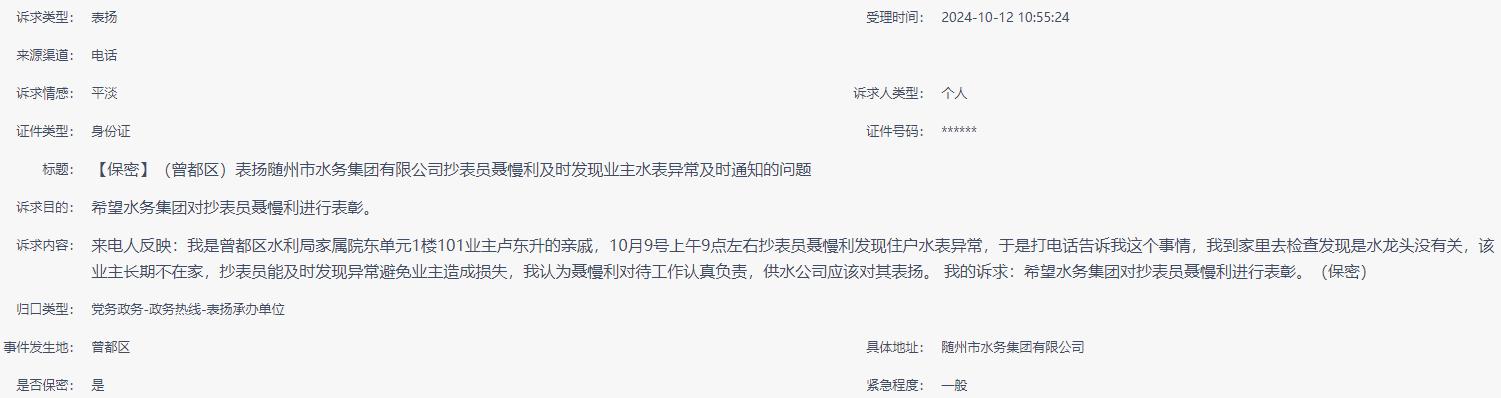 來電人反映:我是曾都區(qū)水利局家屬院東單元1樓101業(yè)主盧東升的親戚,10月9號(hào)上午9點(diǎn)左右抄表員聶慢利發(fā)現(xiàn)住戶水表異常,于是打電話告訴我這個(gè)事情,我到家里去檢查發(fā)現(xiàn)是水龍頭沒有關(guān),該業(yè)主長期不在家,抄表員能及時(shí)發(fā)現(xiàn)異常避免業(yè)主造成損失,我認(rèn)為聶慢利對(duì)待工作認(rèn)真負(fù)責(zé),供水公司應(yīng)該對(duì)其表揚(yáng)。 我的訴求:希望水務(wù)集團(tuán)對(duì)抄表員聶慢利進(jìn)行表彰。(保密) |