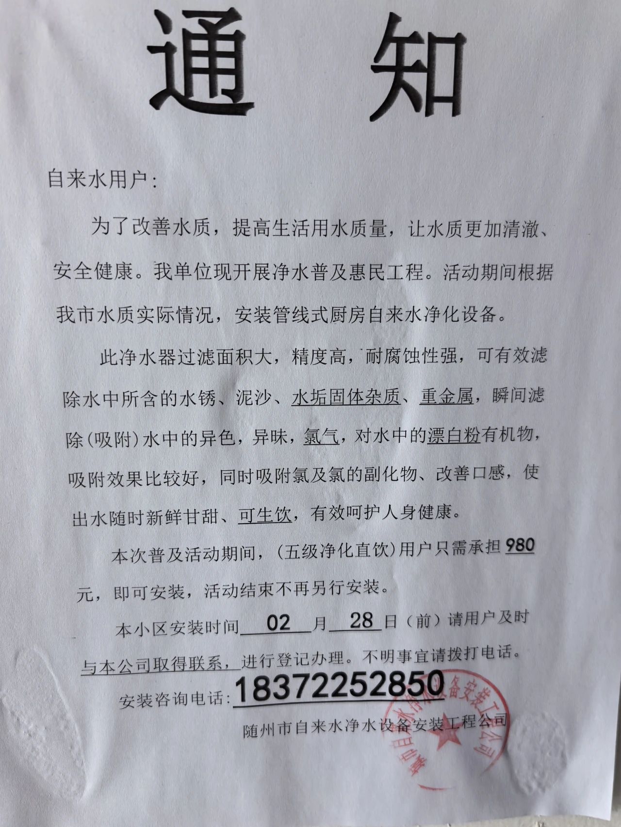 近期,我公司在隨州城區(qū)多個(gè)小區(qū)發(fā)現(xiàn)以“隨州市自來水凈水設(shè)備安裝工程公司”“隨州市二水自來水安裝工程有限公司”等公司名義張貼的《通知》。該行為打著改善自來水水質(zhì)的幌子,誤導(dǎo)自來水用戶,推銷凈水設(shè)備,已造成惡劣影響?,F(xiàn)為維護(hù)我公司和廣大市民的合法權(quán)益,特鄭重聲明如下: