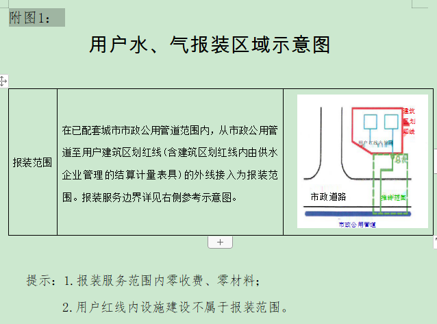 在已配套城市市政公用管道范圍內,從市政公用管道至用戶建筑區(qū)劃紅線的外線接入為報裝范圍。供水、供氣企業(yè)的投資界面必須延伸至用戶建筑區(qū)劃紅線,紅線外連接工程由供水、供氣企業(yè)負責,用戶“零成本”不需要投資。施工結束后,供水、供氣企業(yè)按指定標準恢復市政道路和園林綠化。
